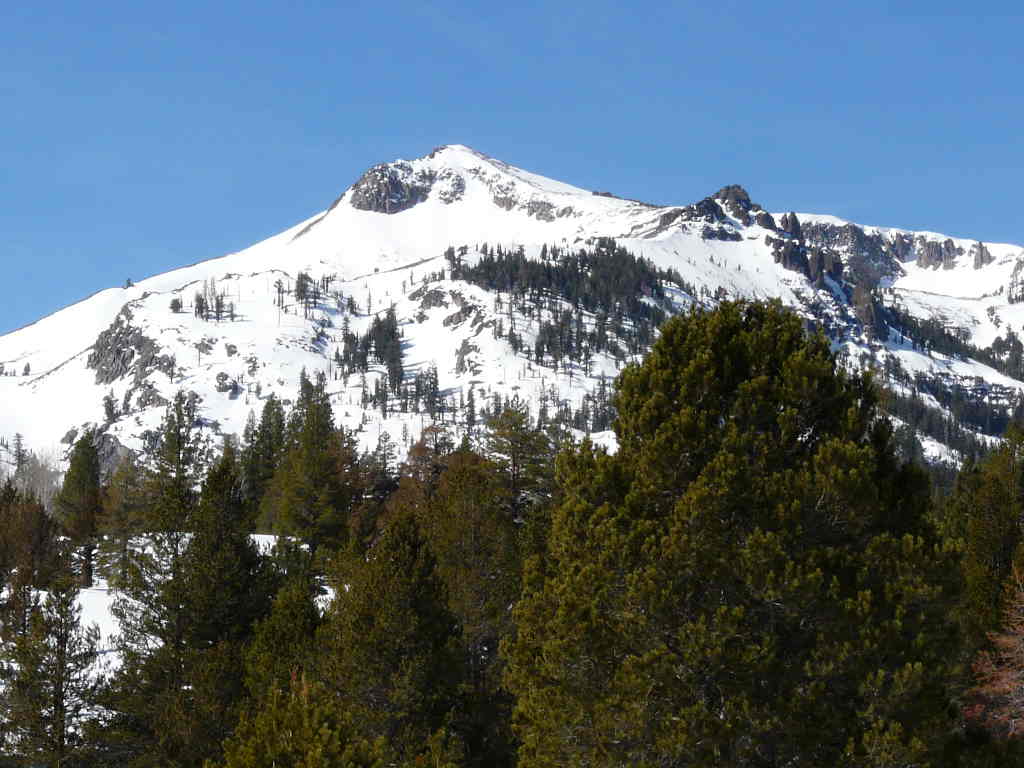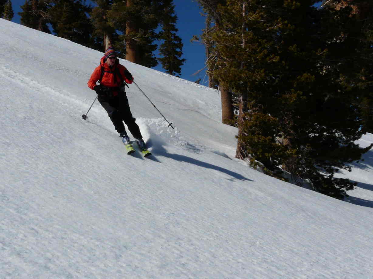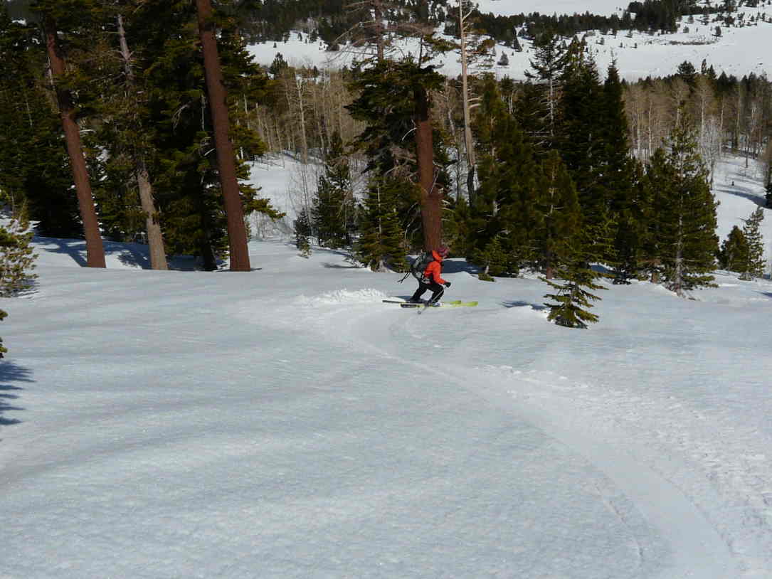 Since returning to the Lake Tahoe area, we have been cruising in spring conditions and using our passes at Heavenly and Kirkwod, plus a $10 powder day at Homewood. Sunday was another perfect sunny spring day and we slept in waiting for the corn to ripen. We drove to Stevens Peak which is just north of Red Lake Peak/Carson Pass. At just over 10,000', Stevens ihas a pleasant SE approach from highway 88. We started at noon; the lower approach is through lightly treed terrain that protects the snow and provides enough shade to keep you cool in the warming spring sun. Once we broke out of the trees we followed a drainage up to open slopes with numerous aspects of ramps and bowls. This year's snowpack is much deeper than last year's, but lower than the epic 2005/2006 season. Spring touring in the Sierra is wonderful.
