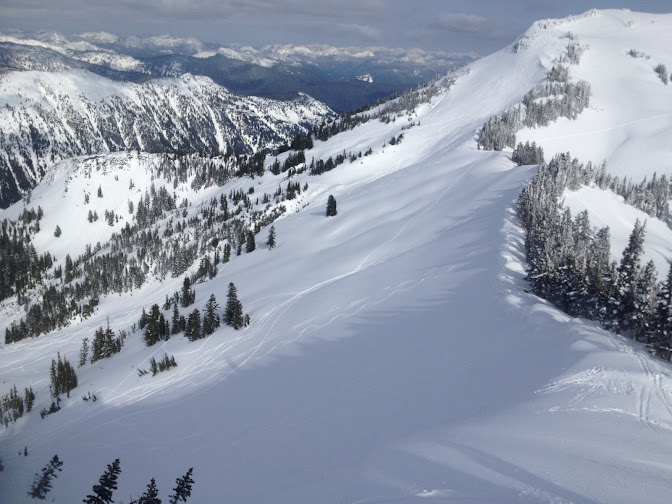 Oh man I was jonesing so bad to get a taste of that amazing powder that arrived last week (non-skiers have no concept of the agony and are even more confused when you are excited about cold temps in the city that were preserving the goodness). Finally Sunday arrived and I headed out with Kevin (TAY BrewSki) and Mike (aka The Muffin Man, TAY Mike B). We decided to head out to the Tatoosh to take advantage of predominately North facing slopes. As others have reported, snow that had been sun exposed the days prior was barely skiable so that ruled out the Southern aspects entirely. They could have been done later in the day after the sun had softened back up but that would have been silly given the pristine condition of North facing slopes. Nary a whoomph, crack, or slide the entire day.
