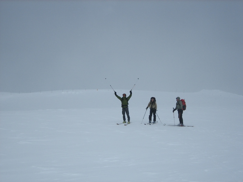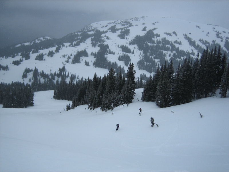 This morning the high alpine was pretty socked in and there were snow flurries. We skinned across the Musical Bumps heading for Whistler. As we climbed up Flute we were enveloped in a complete whiteout which got me wondering how we were going to notice the cornices on Flute bowl before just skinning off the top of tem...and then we all got a good laugh when the weather cleared for a minute and we could see the Whistler boundary fence about a hundred yards straight ahead. (I'm still not happy about Whistler's expansion into the Flute bowl area, but their big boundary fence was a bit of a welcome sight)