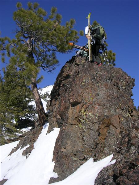 We made our way over occasional cornices and rock outcroppings that briefly required hand over feet climbing. Wayne enjoyed this in his climbing boots, which he later impressively skied in with style!