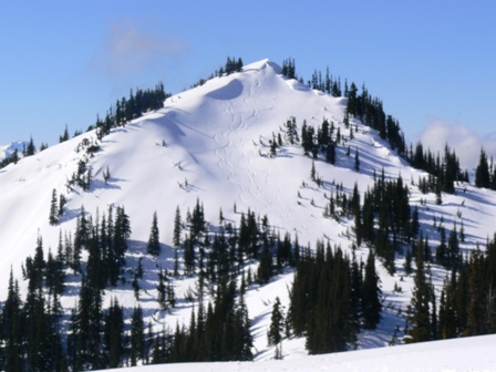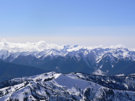 RonL and I met in Poulsbo and headed up to Hurricane Ridge discussing the options. After chatting with the friendly rangers we headed past the ski lift and Sunrise Point to a few turns and a quick boot to the Angeles saddle. Visibility was great---the Strait was in clouds but we could see almost all the peaks. Warm, sunscreen morning; very firm with 1-2" new that softened quickly.