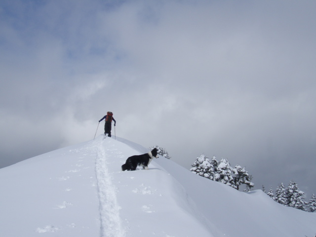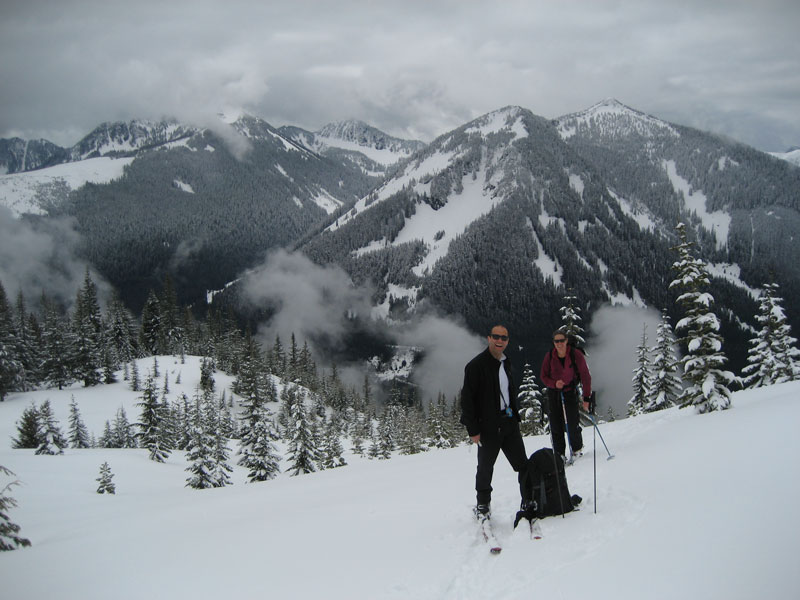 Folks call this "West Granite" often but I like how the "NW" rolls off the tongue. Betty and I left Roslyn around 7:00 AM and met up with Mr. Doober at the Granite Mtn. TH. Betty and Mr. Doober¦ yeah you guessed it: Alpental Patrol surnames! I did wear my Alpental Bark hat to fit in a bit! Anyway, clouds held in to a bit past noon, which was good for us as our goal was to get to the top and then head down a NW aspect from 5500ft. to 4000ft. As Trumpetsailor mentioned, not quite as good as yesterday must have been. But here is where I've been informed to say it was May blower powder! OK, stretching it a bit, but actually the first 800 vertical feet of descent was quite nice with more than foot of newer light snow and no reaching the crust. Things got more heavy from there down to 4000 feet. A quick 500 feet of climb was all it took to get out. Had things held in we would have climbed back onward to the top for a second run on another aspect, but in crossing a west aspect things had got pretty mashed potatoey. From there it was a loooong fun downward traverse all the way to the Granite Mtn. Lookout Trail junction with the Pratt Lake Trail. And we even got to ski the trail down to past the switchback at the base of the big slidepath (second switchback 2200 ft.) and a few hundred yards beyond. In skiing down from the summer trail junction, the level hard packed tread was about the only place that was still holding snow! A short walk later it was back at the TH. Expect to be walking very soon up 'till about 3000 ft.