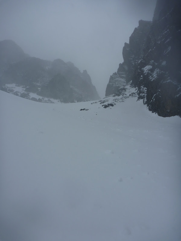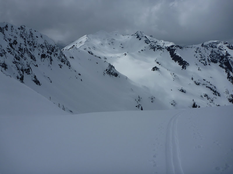 Our ride was going to hike in and meet us around 2pm in lower Royal Basin, so just in case, we planned an early start for Monday. Our last obstacle was the Needles and we had hopes of summiting Mt Deception. Overnight the weather came roaring in again, this time with more force, and no one heard there alarms on Monday morning. We woke up around 6 and were skinning away at 7, first up the steep and icy slope to Deception Glacier basin, then up to the head of the Glacier. We had planned on skiing down the normal climbers route to Royal Basin. After fighting sustained 50+mph winds up the glacier, we had lost any desire to summit Deception, and I was looking down the climbers route into Royal Basin. Poles (and the ice ax at times) were out as I scouted from the top of the ridge. The winds were from the South and East, and the Royal Basin side looked scoured. With no ropes, a 60 pound pack, and tired legs, there was no route down that didnt seem extremely risky. With fresh legs and no pack, there wasn't a route down that seemed doable either. The best looking route, though I couldnt see all of it, seemed to traverse from the col to the south on a 10-ft wide sloped snow ledge perched above a 100-ft rock face. I believe if we had made that traverse (about 50-100ft), we could have skied down continuous snow into Royal Basin. But with winds that were blowing me off balance without my pack, and no fall protection, this was a no go.