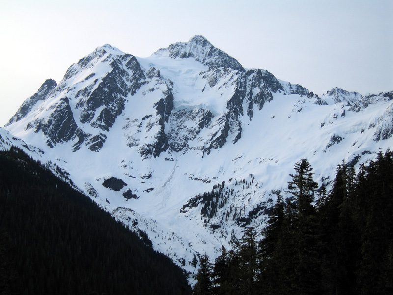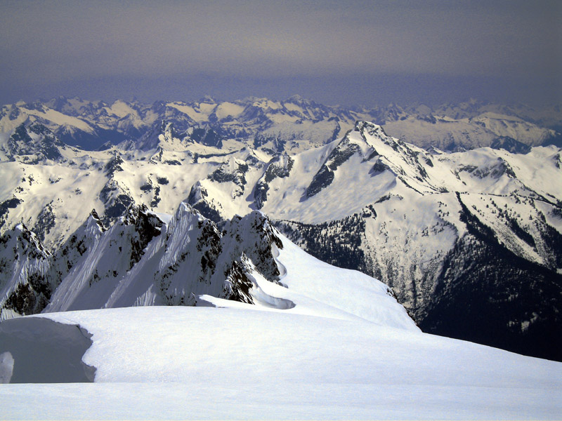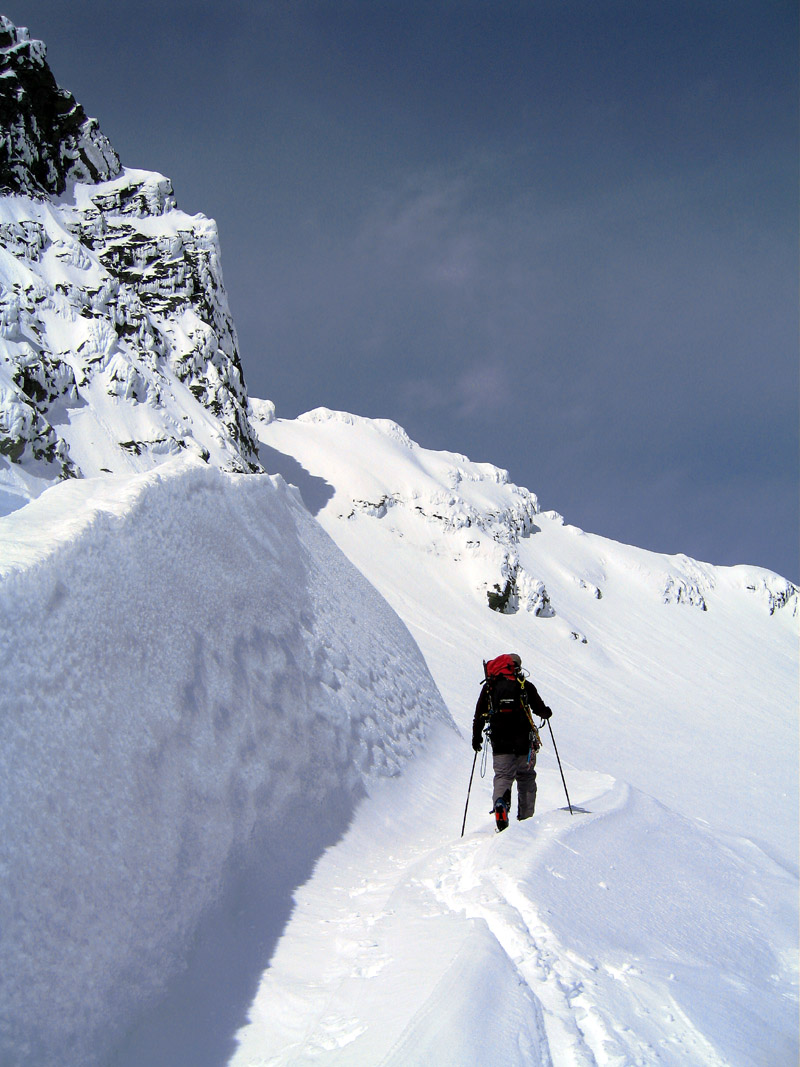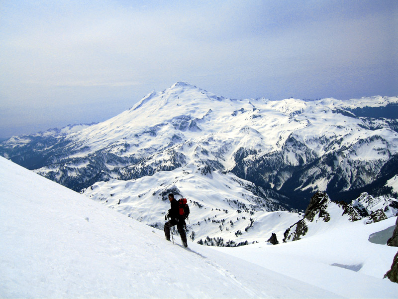 We started around 7:15 am from the lower Mt Baker parking lot on the forest road towards chair 8, dropped a little altitude at the end of the trail and stayed arounf 3400-3500 feet up to the end of the valley. The head of the valley had beeen swiped by avalanches from all directions, but with the freezing in the last couple of days things looked good and we skinned up towards Winnie's slide at first on a very hard snow pack. Around 5000 -5500 feet the snow got deeper - this was last Saturday's snowfall with important accumulations on some aspects (well over a foot of unconsolidated snow). We booted up the ridegeline on one of the steeper slopes following the tracks of a climber who had made the ascent the day before.