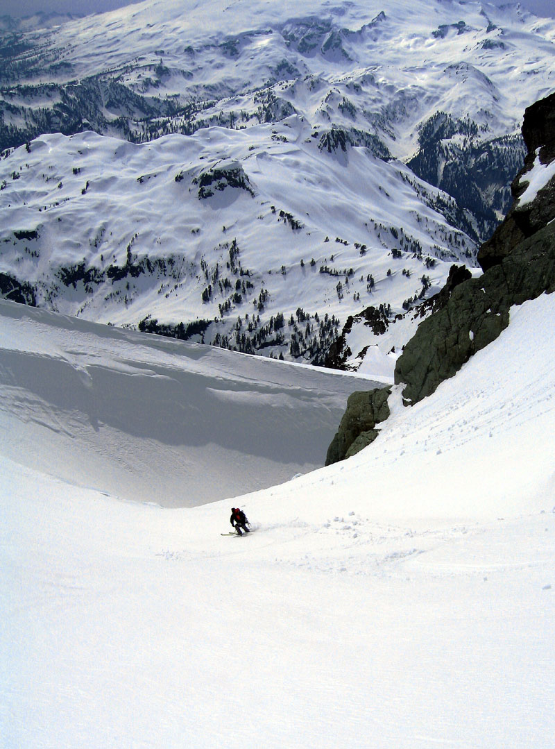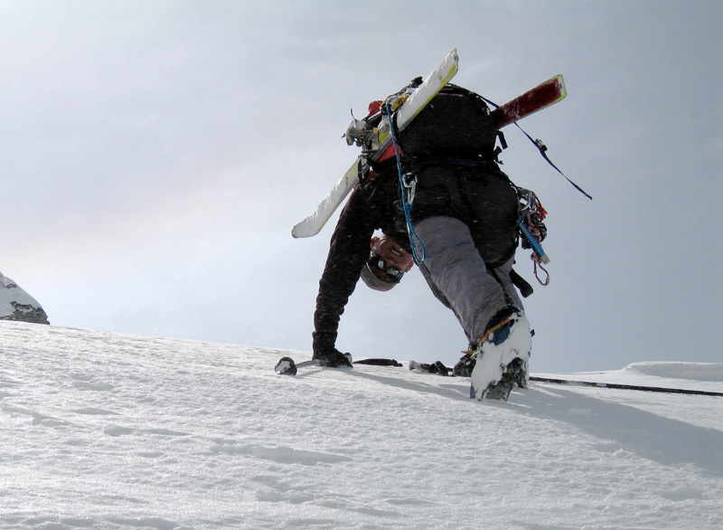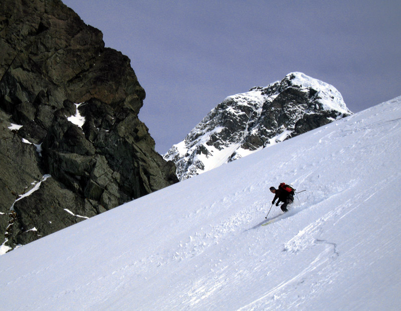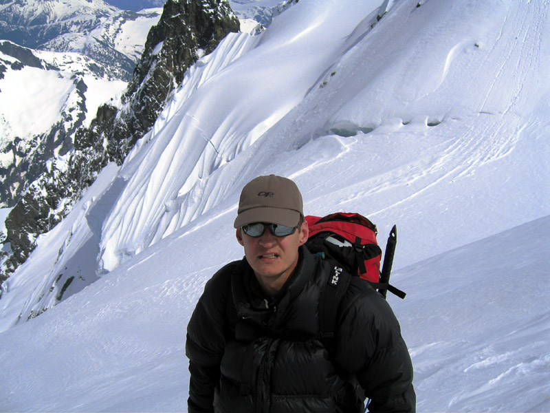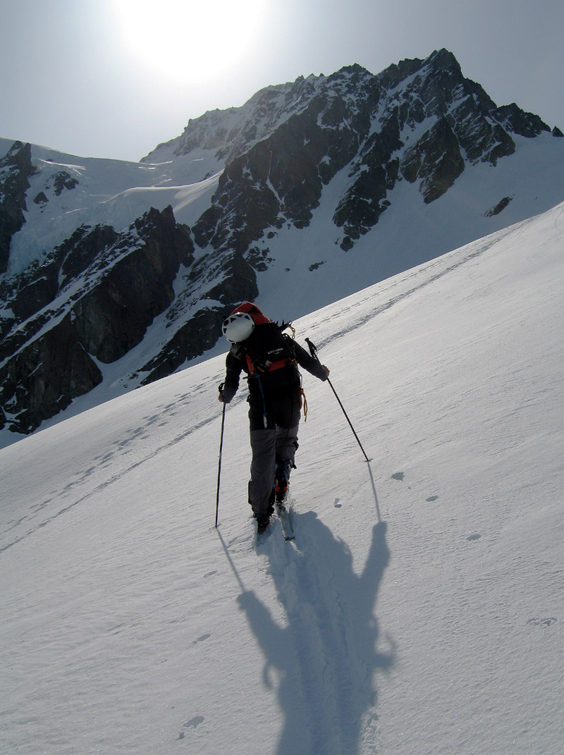 At Winnie's slide, Magali, Fleur and Etienne decided to stay back and Greg and I continued up. We arrived at the top of Hell's highway about an hour and a half later. We decided to not go up the Summit pyramid and do the circumnav. When we arrived at the col, above what we thought to be the hanging glacier, we started skiing down and after a couple of turns I looked at Greg and said: "man this is A LOT steeper then what I thought this was going to be" and Greg nodded. Quickly we realized that we were actually on the Price glacier ;D. We skinned back a few hundred yards and then dropped in on the right col, to the hanging glacier where we had some great open slopes with great corn snow. Ski down was great all the way to 5000 feet or so where the snow was getting really heavy.