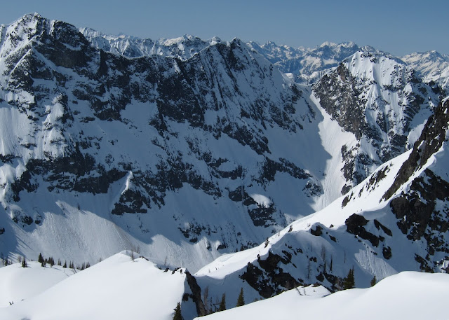 i had been thinking of going for this line (stiletto couloir?) but the big cornice sitting on top in the sun changed my mind.