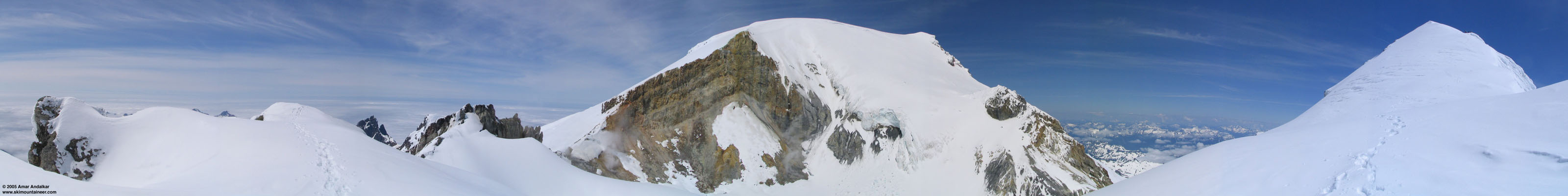 We skinned , eventually skinning to 9800 ft just below a saddle west of Sherman Peak with a panoramic view looking back SW at the , small and narrow with dizzying drop-offs on three sides, with an in-your-face view of Boulder Glacier tumbling down the upper cone of Mount Baker above the steaming sulfurous depths of Sherman Crater. (View a 10-image panorama showing the crater rim, Mount Baker summit, Boulder Glacier, and Sherman Peak, at 3 resolutions: 1600, 3200, and 6400 pixels wide.)