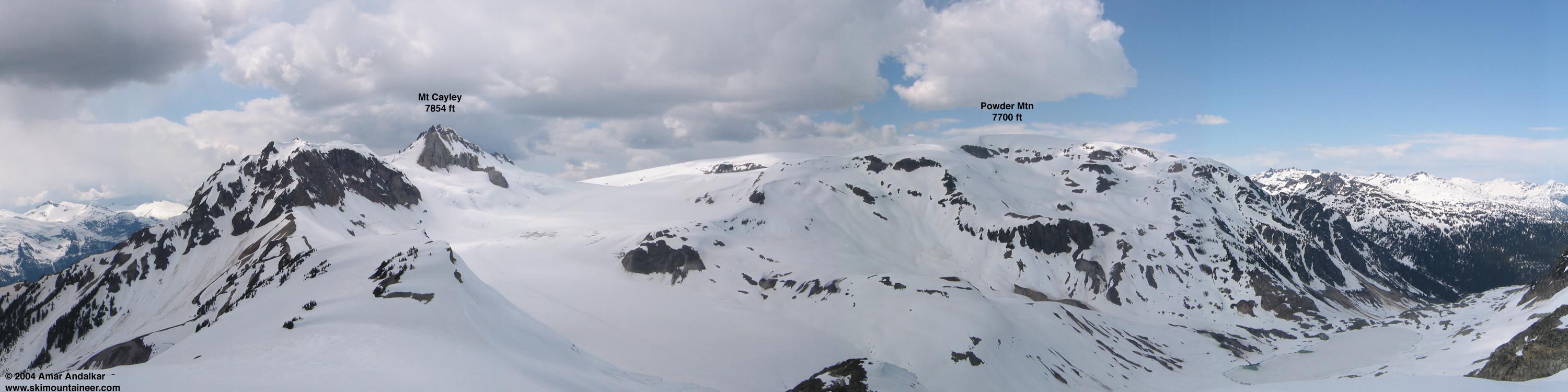 This panorama (composited from 5 photos) looks across the Cayley massif from the 6700 ft knob on the east-west ridge connecting Mt Cayley to Brandywine Mtn. Powder Mtn is a lava dome at the eastern edge of the plateau icefield on Mt Cayley's north side. The cirque lake at 5000 ft is visible at lower right. click here for an enlarged version of this photo, 3000 pixels wide.