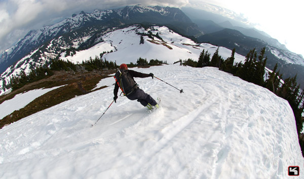 three weekends ago, rain forced us to cancel a Mountaineers' glacier travel and crevasse rescue field trip to the Nisqually Glacier. hoping for better weather this time around, we rescheduled to this weekend. on Saturday, . the snow below Pan Point is patchy, but you can still link some nice turns here and there (skier: gregL)