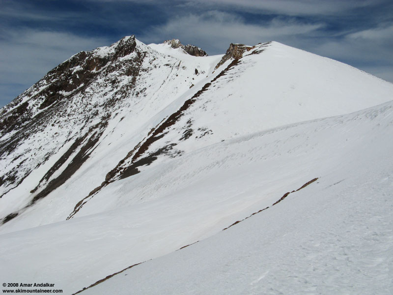 I switched to booting up with crampons as the slope steepened and roughened further. My quick pace of the morning slowed greatly as a gusty headwind made upward progress challenging at times. There's lot of rockfall in Avy Gulch right now (helmet mandatory!), but most of it is well left of the climbing route by several hundred yards. A few rocks did cross the route below 11K, after I was well above that, so it's best to move quickly on the angling traverse below the Heart. Above the Heart, the route now cuts through a deep chimney in the Red Banks at about 12500 ft, a spectacular narrow finger of snow 4-6 ft wide in places, threading through reddish cliffs with waterfalls of meltwater cascading down. Icy snow in the 40-45 degree steep finger, along with an increasingly gusty headwind, required a bit of care and attention (I carried 2 Whippet self-arrest poles, but the ice axe stayed in the car). I reached the summit plateau at 13200 ft above Red Banks by 3pm, with temps of 33 F and the wind increasing to a steadier 30+ mph, coming straight from the direction of the true summit located nearly a mile NNE, up Misery Hill and across a second plateau. So the decision to abandon the summit was an easy one, especially as the skis on my pack were acting as nasty sails by now, twisting me rudely to and fro.