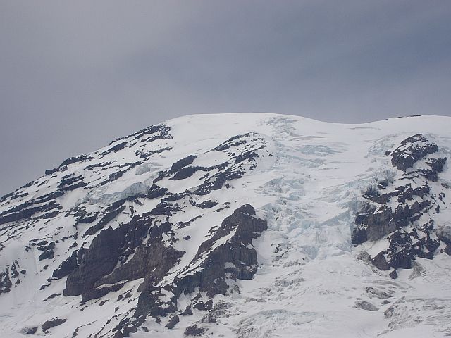 Descended the steeper upper portion of the snowfield (far skier's left) toward the Paradise Glacier. Below that the conditions became fairly grippy, making for an unappealing knee workout.