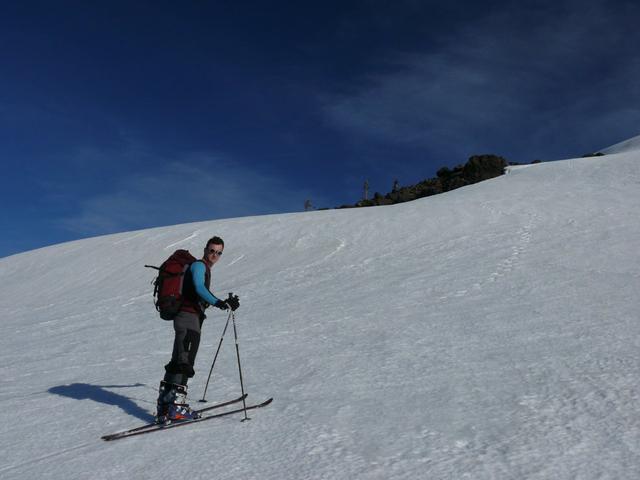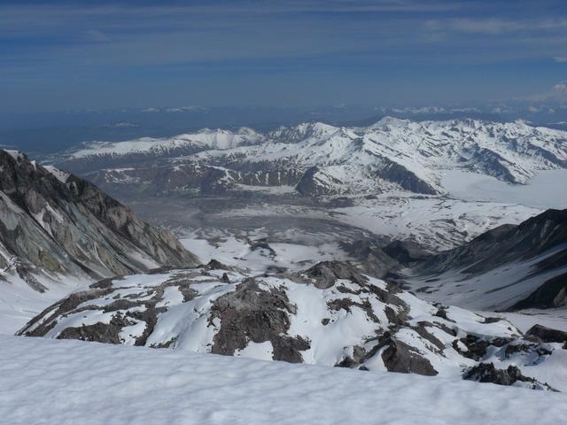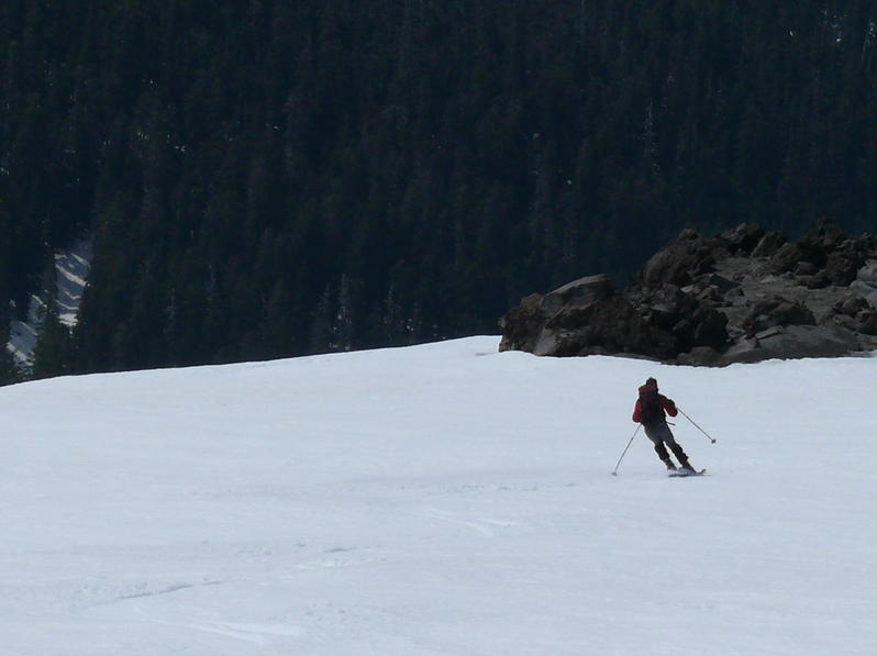 Christian and I left our nice motel in Cougar at about 4:20 am, drove (roads 91 - 83) up to 2200 ft and started skinning at about 5 am, following the standard route towards climber's camp. At ~3300 ft we left that road and turned north towards monitor ridge, which we followed to the crater rim (5 hrs). Snow was good corn, despite the very high temperatures. A bit sticky below tree line. We saw a few mountaineers but no other skiers.