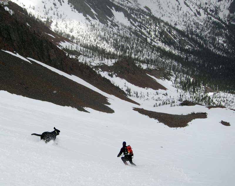 From there we skinned back up to another saddle on the ridge just north of Longs Pass and decided to keep on heading north. We traversed our way around an unnamed peak on mixed snow and rock and then skied down to Ingalls Pass. Decided to head towards Fortune as the final destination and dropped down towards the larchy meadow on the way to Ingalls. A few flakes fell here, but nothing substantial. We then headed up Headlight Creek to the ridge and kept on going until we topped out at the summit of Fortune Peak. The clouds moved in here and obscured our view of the surrounding peaks and valleys, but occasionally gave us glimpse of what was there. The top of Fortune was fun and slushy, but the bowl was wide open and a blast. Lower down the runnels and slushy snow appeared, but was still a hoot. As always survival skiing through the trees made the dash out loads of fun. Finally had to pack the skis up about a mile from the trailhead.