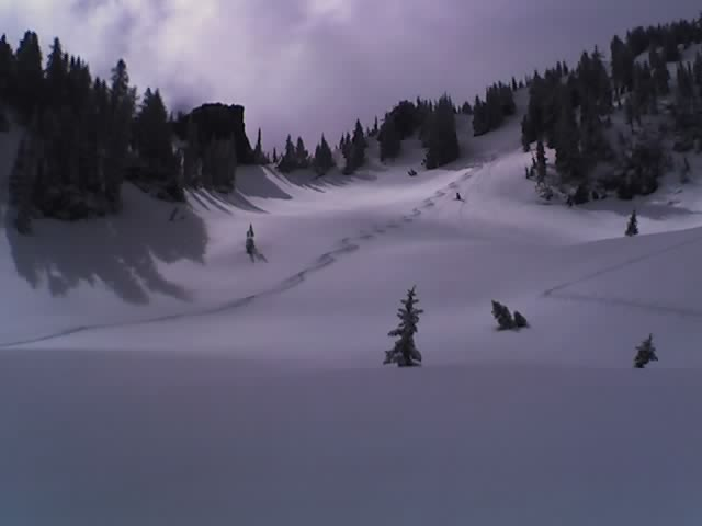 I figured the masses would be at Paradise and WA Pass and we would be alone with all the fresh powder. Well most of the above happened, except, "all the fresh powder". As we approached the Crystal parking lot, there appeared an enormous white tent and a huge gathering of Search and Rescue personnel. Luckily, they were not skiing. Chris another TAY 'er pulled up and was heading up within the ski area. We had to walk to the base of the Quicksilver lift,chair 4, which was about 100vf to reach continuous snow. Skies were variable all day - sun, clouds, snow showers. The FL was about 4700' but was rising as we skinned up. The ski slopes on Quicksilver were consolidated with about 2"ski penetration. As we entered Threeway Peak basin there was about an inch of new wet snow atop an unconsolidated base. We decided to climb the col climbers right of Threeway. The snow was still unconsolidated and the higher we climbed the conditions did not improve. Rob and I decided to stop and as we took off our skis we sank about a foot in mush. The descent was "forgetable". My wide skis were penetrating about 8" and Rob's narrower tele skis sank about a foot. We survived the descent to the top of chair 4 . We had some more pleasant consolidated snow down the slope under the chair. As we were taking off the skis a light rain started and increased as we drove back to Seattle. IMHO, it is NOT worth touring outside the ski area of Crystal until the snow pack consolidates.