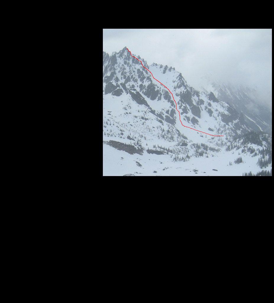 Great looking line. We could not see your tracks from the basin but it is good that you got it when you did because it rained consistently Sunday night through Monday morning. That line was on our short list of tours while deciding where to ski Monday but the rain limited our options.