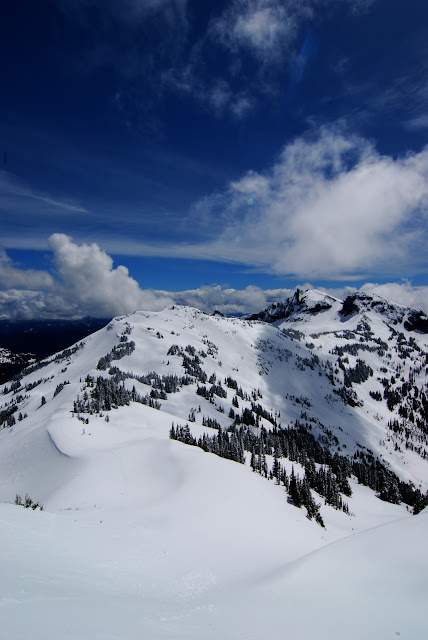 Headed to the Tatoosh to take advantage of the gap between clouds. I parked at reflection lakes at about 9:30. The snow on the way up was pretty firm. Someone had booted up to the ridge over the weekend and only postholed about a foot in. The snow in the upper bowl was fantastic -- a dusting of fresh over a solid base.
