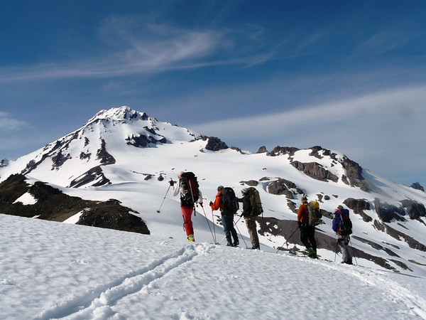 The traverse had been marvelous, and we hoped to top it off with an ascent of Glacier Peak on the fourth day. After Friday's temperature peak, the nights were gradually cooling and we awoke to a good freeze on Sunday. It was a pleasure to leave overnight packs behind to climb the Gerdine Glacier toward the Disappointment Peak saddle. On the final slope below the summit of Glacier Peak we met Linden and Carl, a skier and split-boarder who were making a two-day climb of the volcano from the North Fork Sauk River. High clouds gave way to sunshine just in time for our ski descent from the summit. We found the best corn snow of the trip on the slopes of Glacier Peak.