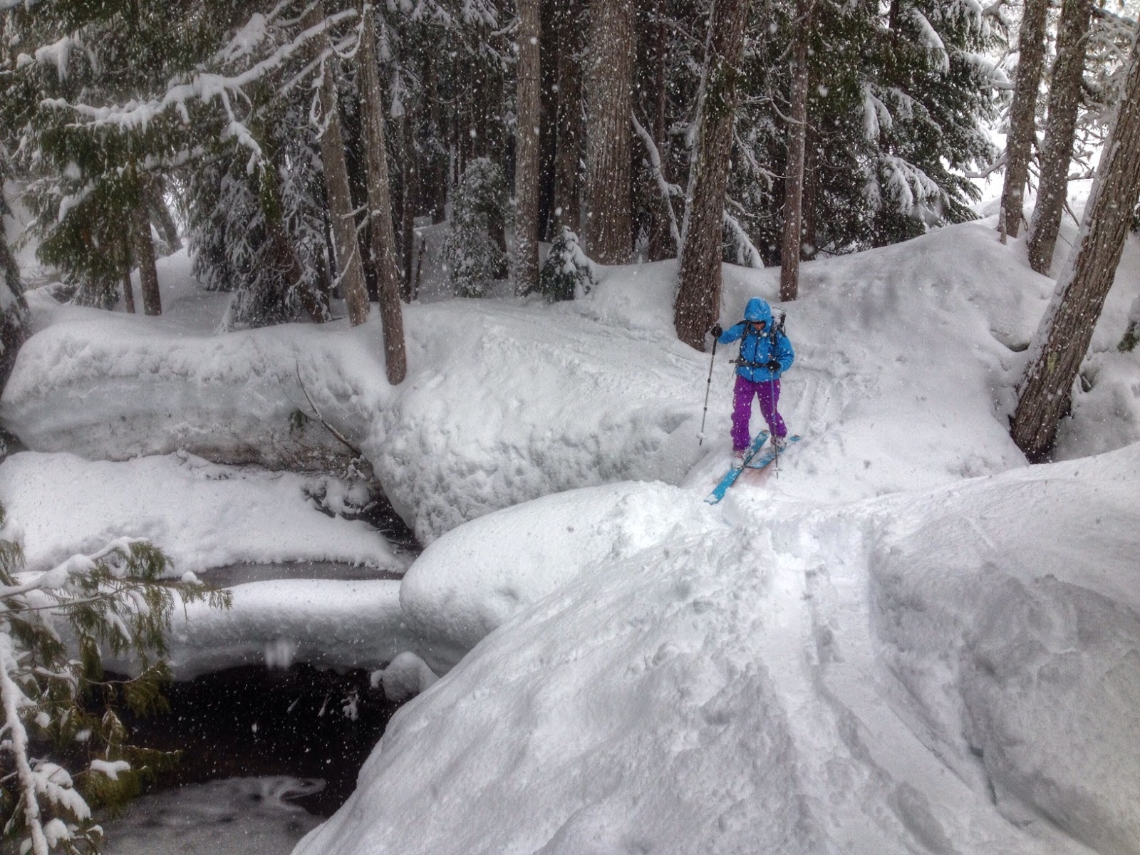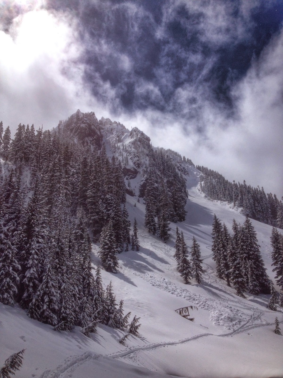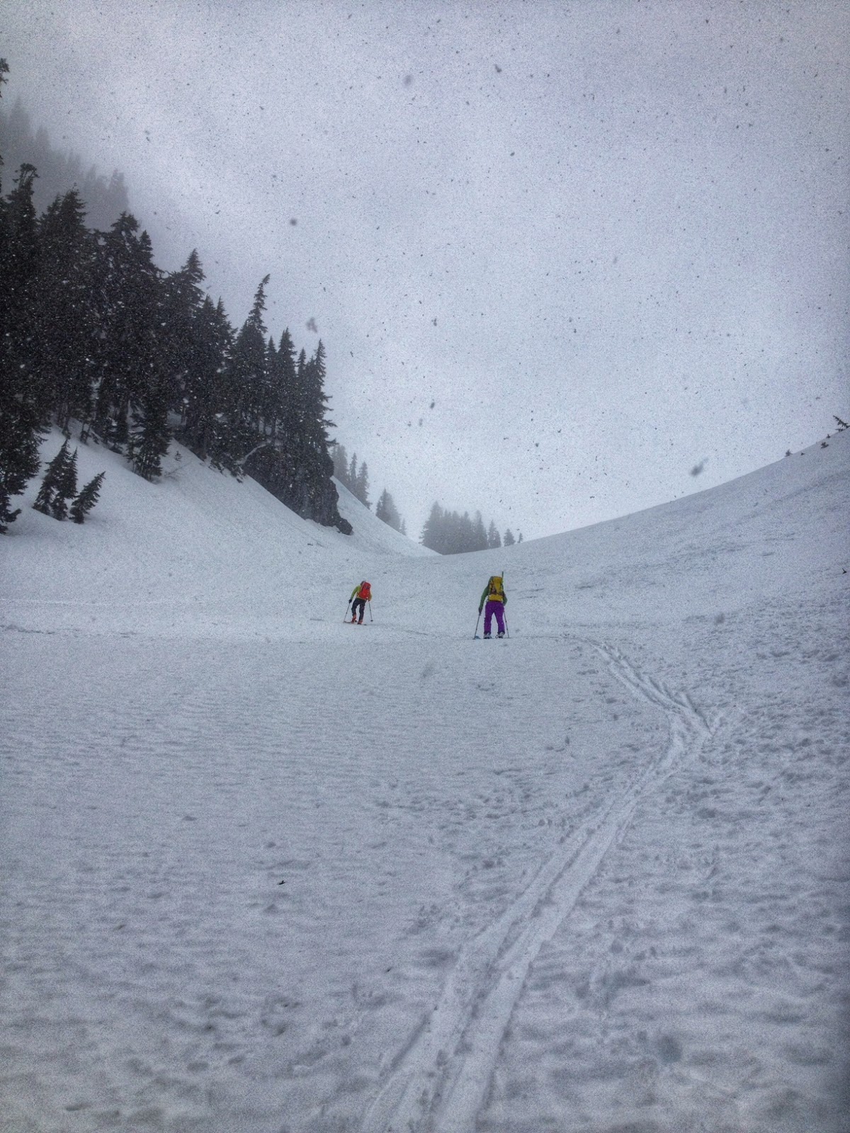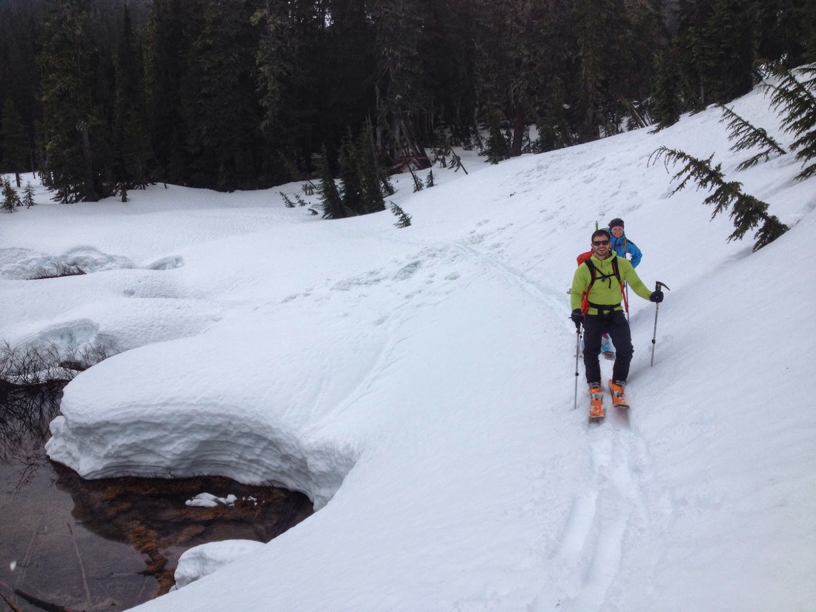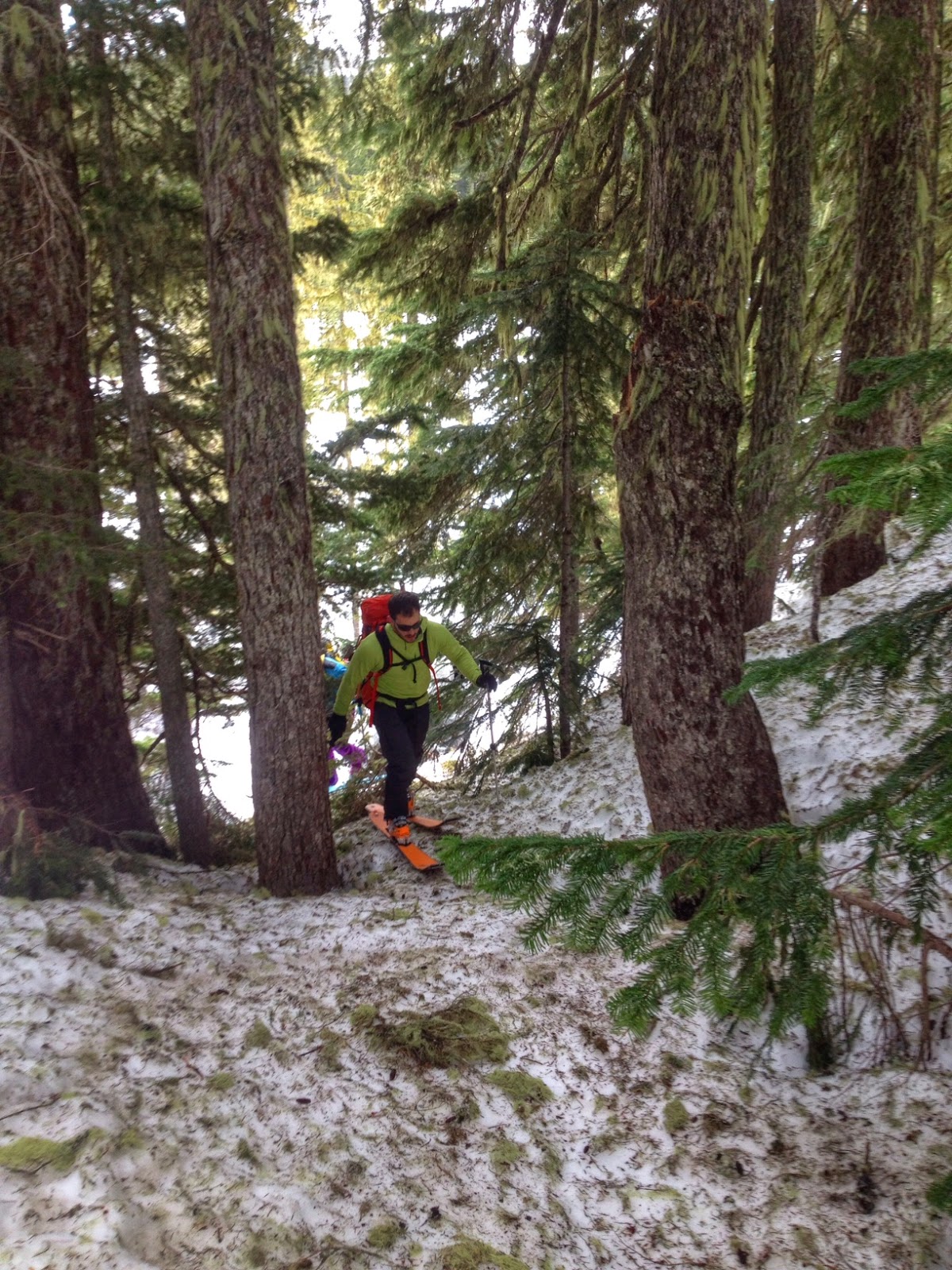 The apron had new wet snow that was some of the stickiest I've ever seen in my life, glad we didn't set out for a 30 degree line. At the bottom we stopped at a rock to eat lunch, just as it started to rain. I ended up touring back out in nothing but hardshells and my underwear due to the heat and constant rain. I love the northwest.