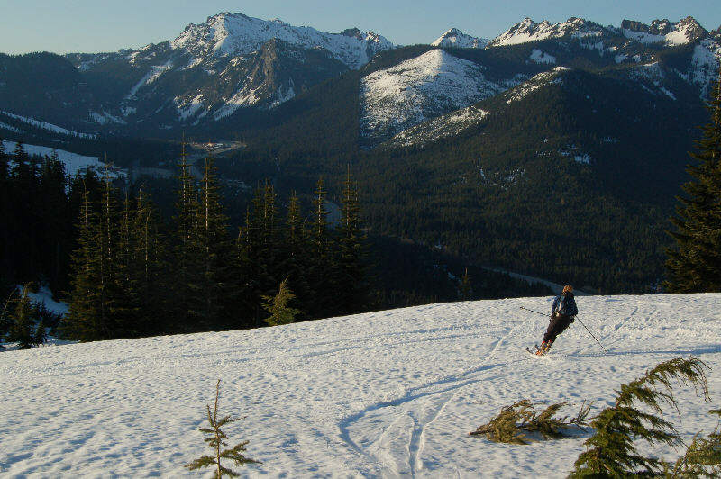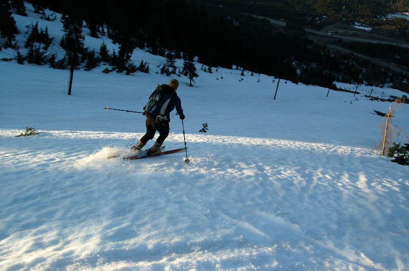 In hopes of finding some after-work corn on a quick ski outing, Allyson and I departed the Hyak (Summit East) parking lot at ~6:30 in the evening sun. The base area is melting-out quick with some large bare patches, but the rest of the route to the top of the ski area still has good coverage (medium-size suncups near the base, less sun-cupped near the top). The shaded slopes were already starting to refreeze, but were still soft enough for good turns. We were rewarded with brilliant evening sunlight and an excellent corn snow harvest on the upper few hundred feet of the descent, continuing the fun turns down the shaded slopes back to the base area (only 1 quick stream crossing near the bottom). Not bad at all for ~1,000 vertical feet of turns and 1 hour car-to-car! :)