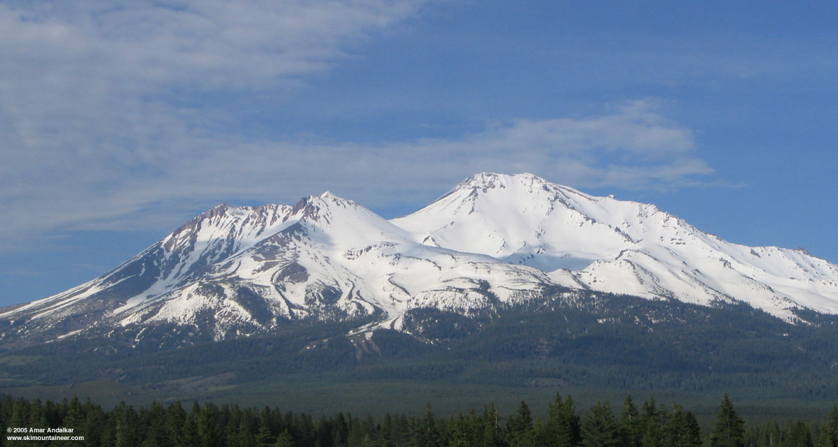 Shastina is the oft-ignored and underappreciated satellite cone of Mount Shasta, completely overshadowed by its towering parent. Nevertheless, Shastina is the third highest volcanic cone in the Cascade Range at 12330 ft, exceeding even Mount Adams in height, and is certainly a worthy mountaineering and skiing objective. Cascade Gulch provides an easy ski route all the way to the summit, while excellent moderately-steep and lengthy ski descents can be found on the South Face, North Face, and Diller Canyon (west side). The NE Face above the Whitney Glacier even offers some very steep extreme skiing terrain. I'd wanted to ski Shastina for several years, but had been thwarted by overpowering winds (70+ mph, too strong to even stand upright) at the 11840 ft Shastina Saddle during my only previous attempt in May 2003.