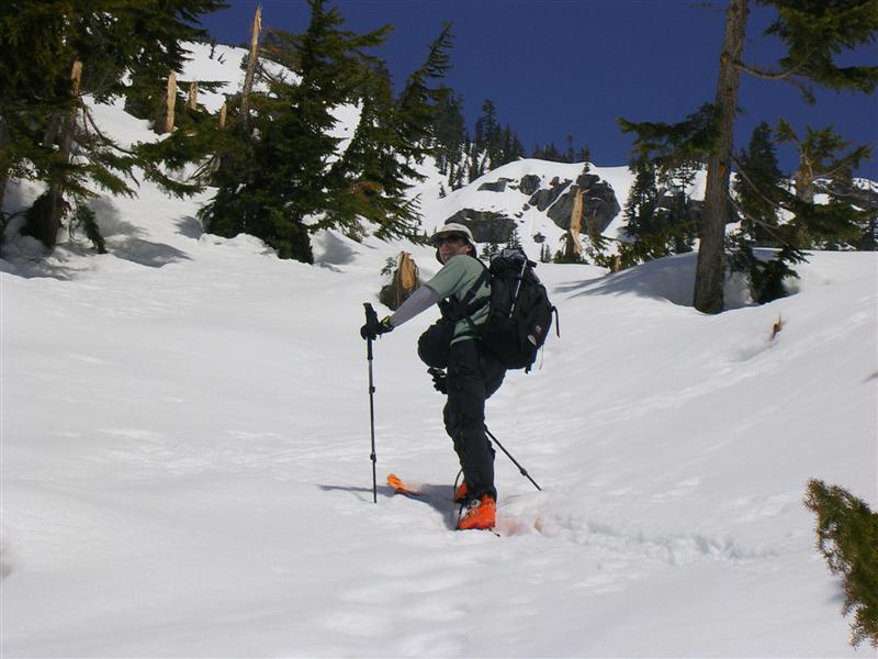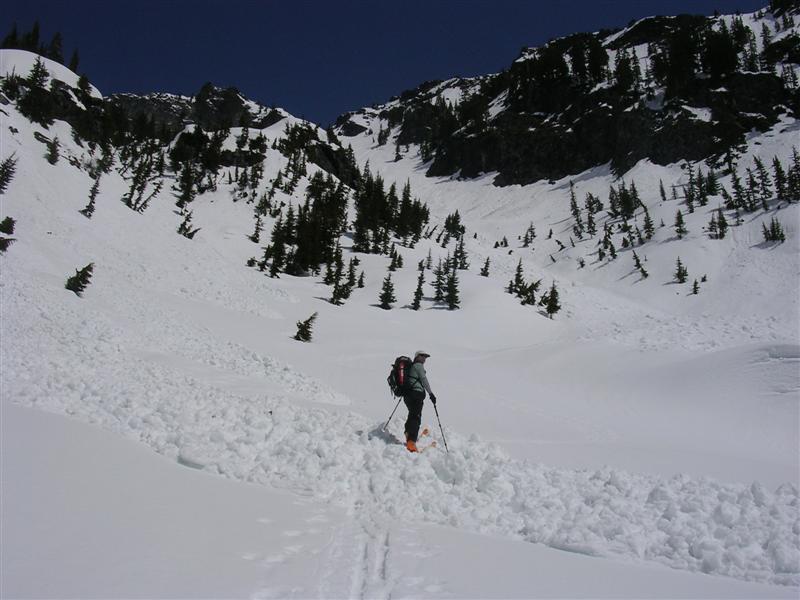 Victor and I set off into commonwealth basin for a look at Red and Lundin with thoughts of skiing Red Mtn. Once in the basin, as predicted, the slides began and more frequent they came sliding off Snoqualmie Mtn. With the heavy snow and frequent thunder of rock and snow fall, we debated on continuing.