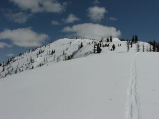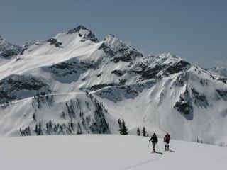 Nice meeting you guys up there today. We hemmed and hawed about whether to go on to Maple Pass after you guys left but as we headed higher to check out the traverse route, found rapidly worsening snow conditions with about 8-10 inches of ski penetration in mushy snow and decided it wasn't worth the risk. From our turnaround point, however, we spied the ridge running northeast from Heather Pass up to Point 6937 and thought it looked like a nice, protected way to get up to some views and some turns. We dropped back down to the pass then headed up the ridge. Skinning was significantly better than on the way up to Maple with a very firm base underneath and we grabbed some great panormas from the top. The ski back down to the pass had some good corn in spots but was quite variable in others. Like you, we dropped down through the trees from Heather Pass to Lake Ann but managed to set off a mess of sluffs. By that time, just about everything was sliding. Only the top 4-5 inches were going and moving slowly and the base underneath was almost as mushy what we had been skiing already. By the time we skied out across the lake, it looked like there had been slides from the south-facing slopes above the lake over just about every stretch of the upper trail traversing that slope that we all used in the morning.