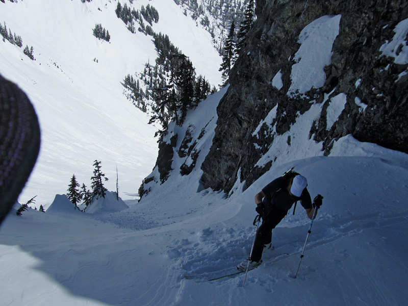 Another race with the sun, but this time we got there a little earlier and picked our line a little more carefully. Zack and I had tried this about a week ago, after the last big dump, on an aimless Snoqualmie outing that - eeny meeny miny mo - took aim at the chutes. We did alright without a map and limited visibility, but got turned back by a steep South facing slope that neither of us felt too good about. Arcticcat2 joined us this time. Visibility was no problem. In fact it was a glorious day! North facing was still holding a little bit of the lighter snow and the rest was all variously effected by the sun and all the other myriad factors...