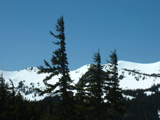 After Sundays whiteout experience at the back bowls at Paradise, the drizzle convinced me to travel to White Pass and tour Hogback on Monday. With the Stevens Canyon road closed, it is a long drive back around to White Pass. I spent the evening at the deserted parking lot across from the ski area which is closed.