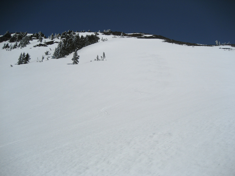 The skiing: I quickly stripped the skins and managed the short run on about an inch thaw of corn on the supportive crust. But I did learn that by 11:00 AM southeast slopes were basically shot. Then it was on to the pleasant traverse through open subalpine park slopes and up the south ridge of Silver Peak. To my surprise, the south rib slope was staying firm with only about an inch of thaw. Not only could I not put my fist through it, it was hard to push 4 fingers into it. Go figure. Good part was that the route had snow completely to the top so I would get a run directly off the summit.