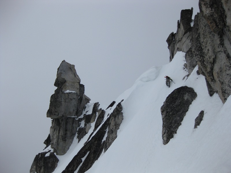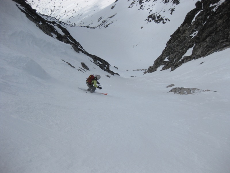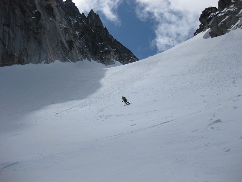 The snow in the gulley was too hard to safely ski in both our opinions, even with the sun on it. It was cold up there this early in the day. Getting down it with skis on could be done, but would have required alot of side stepping and maybe some belayed skiing. A fall would have dire consequences so we went to the top instead. Skied down to the couloir after summiting, but it still looked like it hadn't softened a bit so we skied down to the col and hiked up the couloir lookers right from the col and traversed to the summit of Dragontail and took a nap. Reversed the route and skied down Colchuck Glacier to the lake. Snow was still hard; only about 1000 ft above the lake did it start to soften.