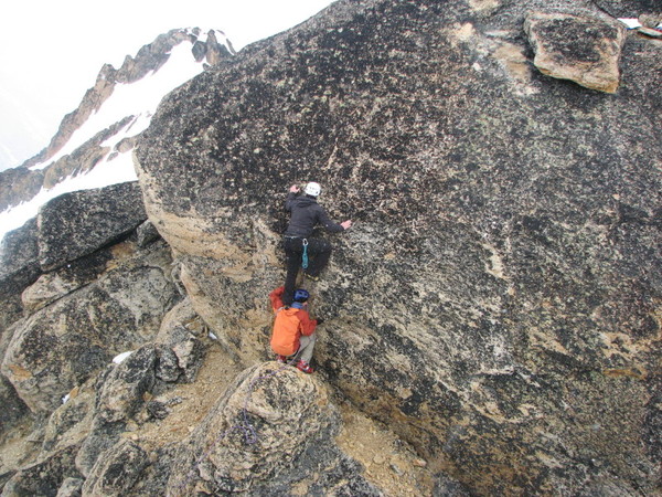 The ascent gulley has a triangular shaped chock stone that you had to climb under. From this point we put Matt on belay and he led the crux section in style and belayed us up over the verglasse. From here it was easy scrambling to the summit rock. Tim put his rock shoes on, got a shoulder boost and voila he was on the top. He clipped a sling on top and the rest of us top roped the summit rock. A short rappel brought us back below the chock stone (we had a 30 m rope).