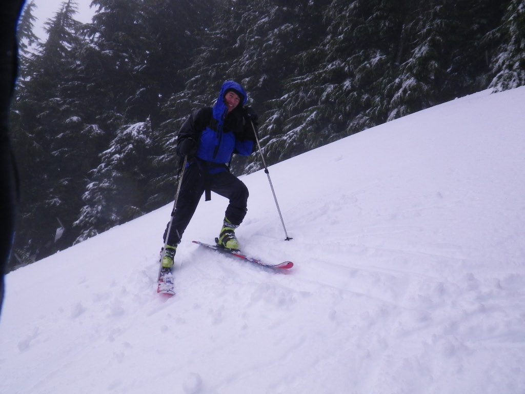 Actually the snow was pretty good. There was about two inches of new snow from the night and a solid crust under that which supported us well. We made six runs on the open slopes above the road. By the last few the crust was getting soft and i was starting to break through but it was still fun skiing!