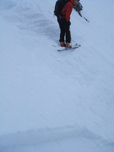 We entered The Slot apprehensively. Although there were no major signs of instability on the approach, we were concerned about a windslab in the upper Slot. Sure enough, about 40' into the slot a vigorous ski cut released a soft slab ~10-12" deep. Concerned about stability below the Slot, we climbed back out and skied back down in the general vicinity of the Phantom.