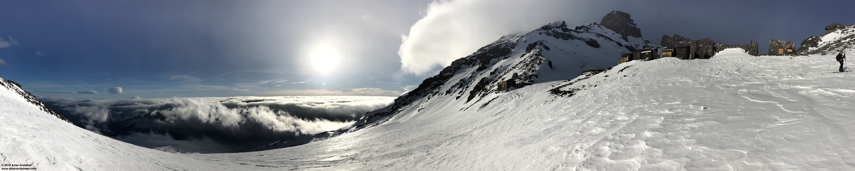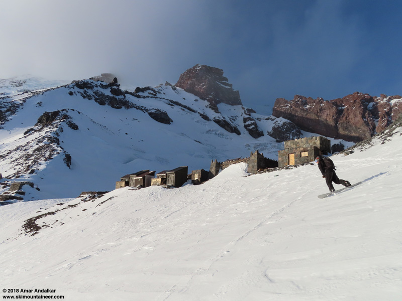 We arrived at Camp Muir just after 3pm, and despite the strong winds overhead in the summit lenticular, the wind was only about 10-20 mph at Muir. And thankfully it was possible to find an almost calm, wind-protected spot on the deck of the new stone restroom facility, still under construction after 3 summers of work. It felt kind of surreal to have complete solitude at Camp Muir on a warm sunny day, after the busy party scene of November 11-12 in similar weather.