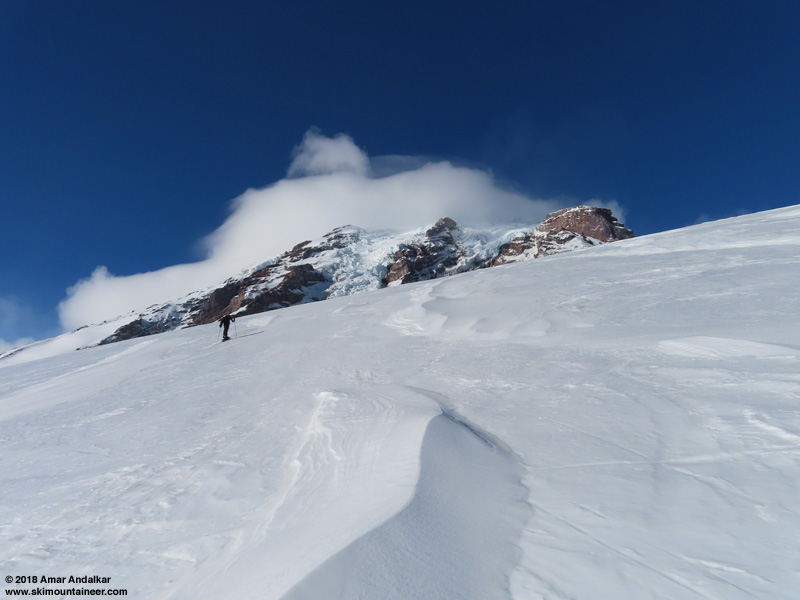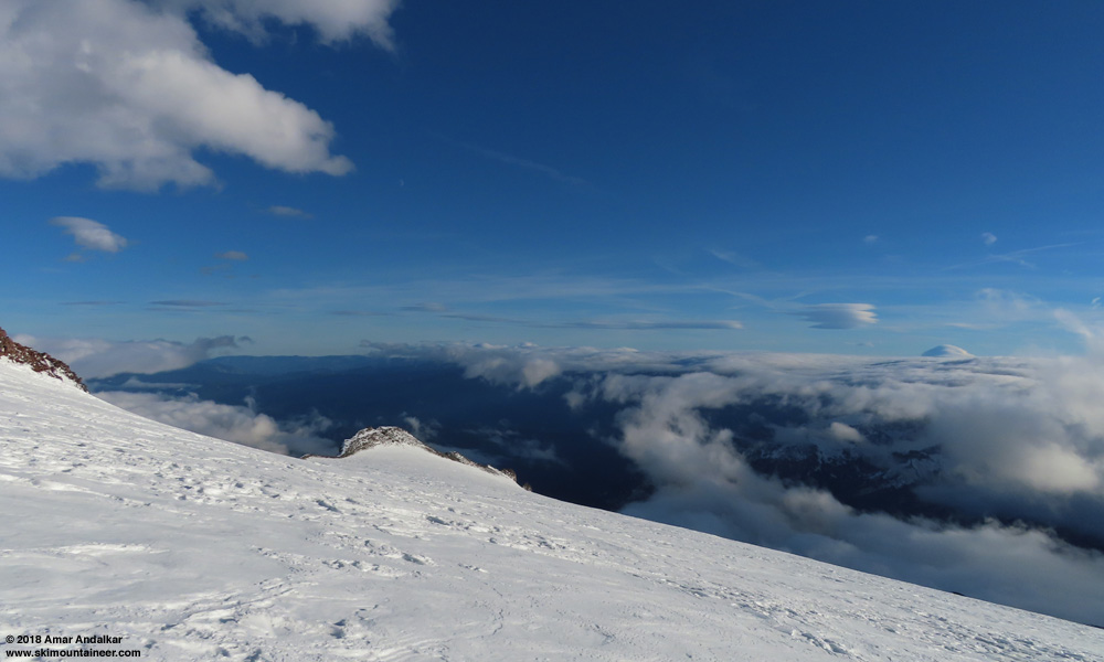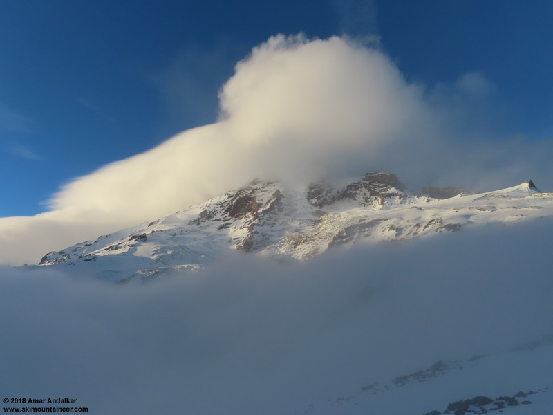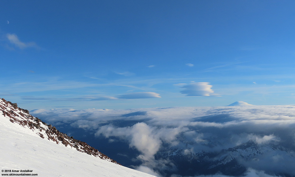 There was barely 1 millimeter of new snow atop the old snow surface at Paradise, increasing to maybe a centimeter by 6500 ft. The skin up the summer trail route at Panorama Point was icier and harder than it had been on November 11-12, and ski crampons were very helpful from 6500-7200 ft, but Pan Face looked much worse and was not even worth considering as an ascent option. Looking south, a nicely-formed smooth lenticular capped Mount Adams too.