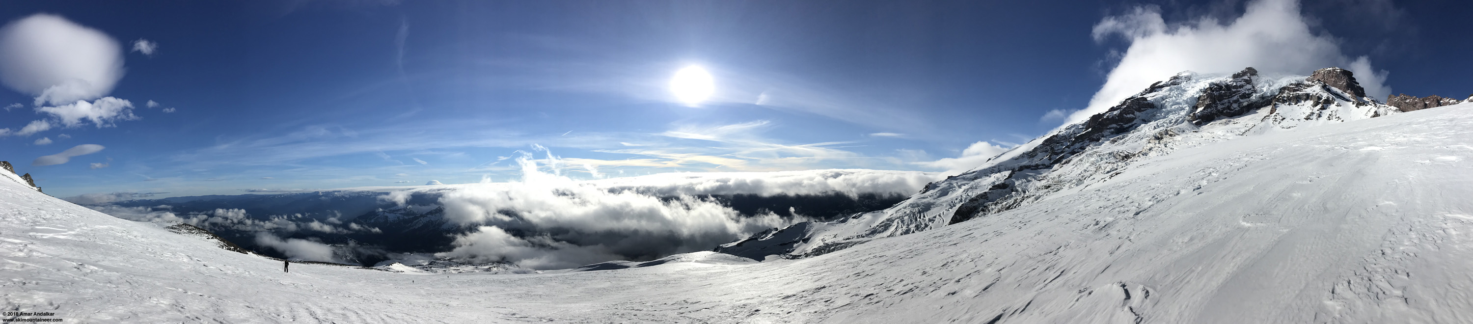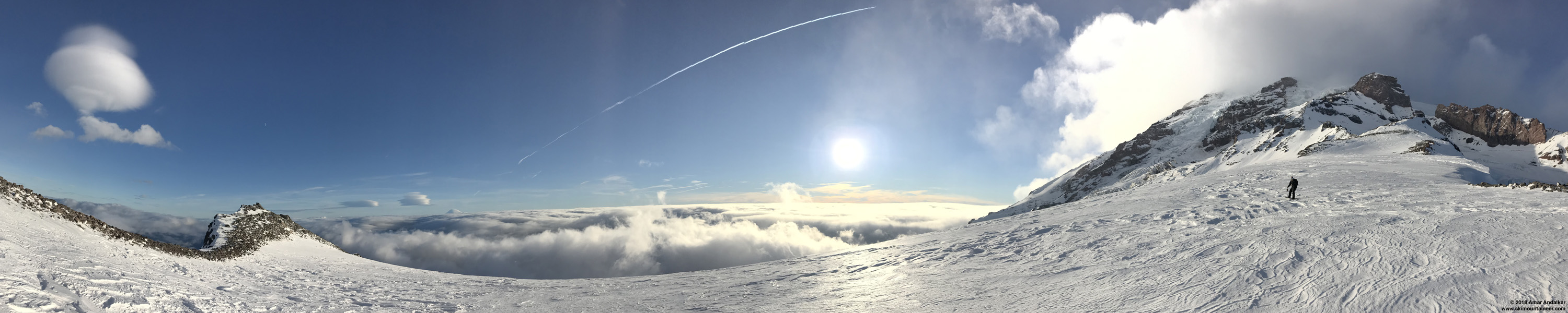 Panorama looking downhill from about 9300 ft, with the lee wave lenticulars at left, Mount Adams with its own lenticular at center, and the splitboarder and 2 skiers skinning up below. (click for triple-size version)