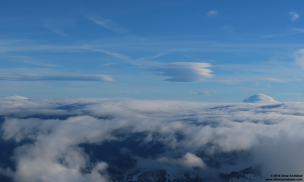 Zoomed view from 9900 ft of Mount Adams enveloped in a lenticular cloud with a train of lee-wave lenticulars extending left.