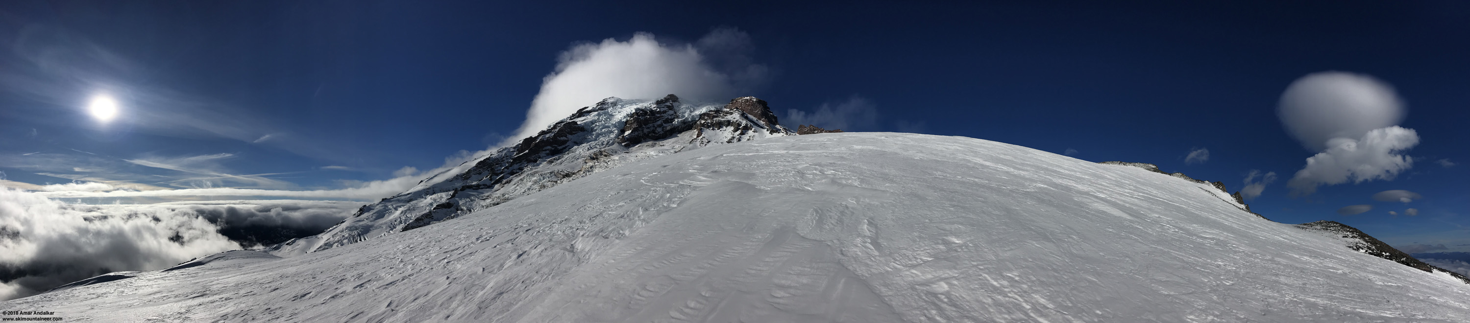 Panorama as we arrived at 10100 ft Camp Muir, with Mount Adams at left enveloped in a lenticular cloud with a train of lee-wave lenticulars. (click for triple-size version)