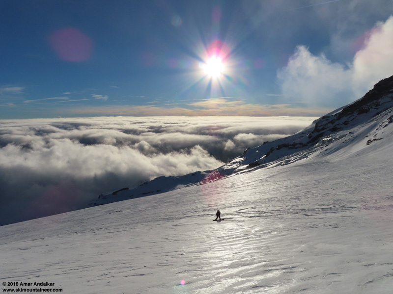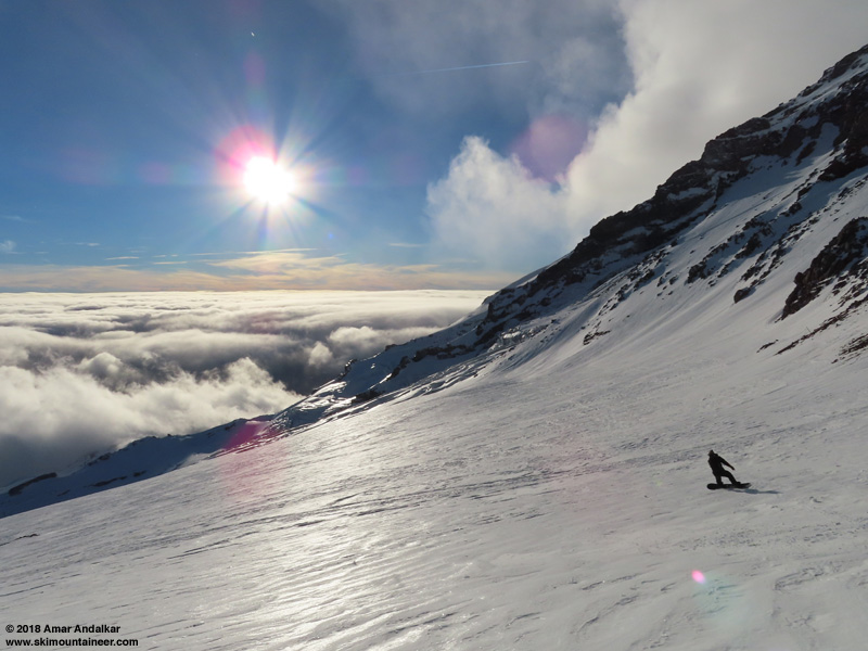 Eventually below 8000 ft, the pseudo-firnspiegel rain crust vanished and it was just smooth amazing windpacked snow. Excellent fast turns here, definitely the best snow of the day. Pseudo-firnspiegel is nice, but it's still not quite as nice as real firnspiegel.