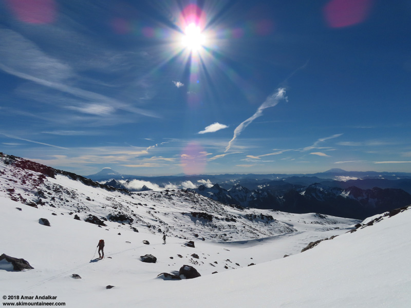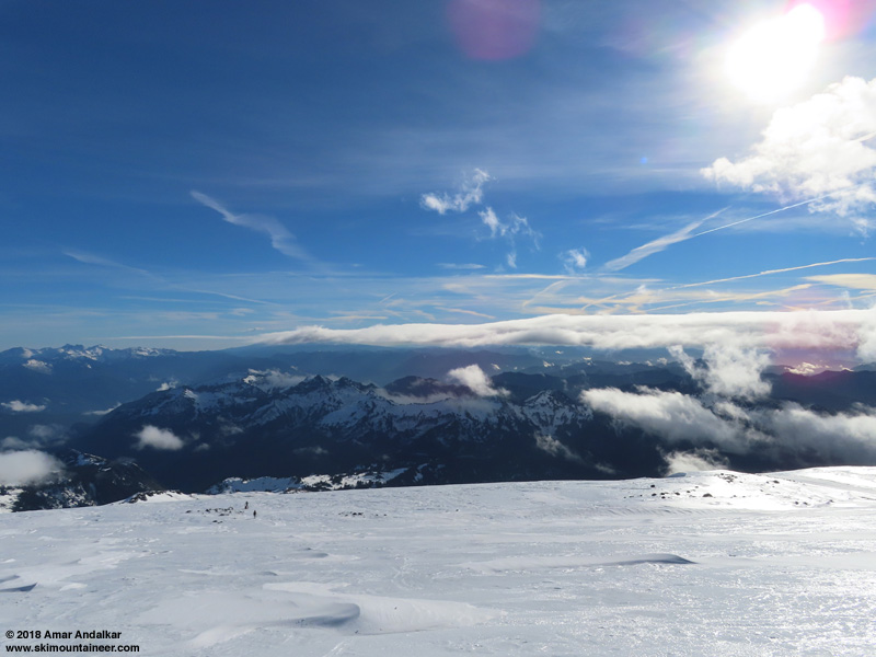 In addition to the lenticulars atop the summit, a series of lee-wave lenticular clouds now extended downwind of Rainier to the east, with 2 or 3 complete waves often visible. Progress had slowed with all the icy sections, and by 2pm we were only at 9200 ft, but at least above this elevation the skinning conditions improved. The coverage of new snow atop the ice layer increased to more like 50-80% of area, which made it much easier to skin mostly on snow instead of ice. The only 2 other skiers who had made it above 8000 ft turned around near 9000 ft, and above that it was only me and a splitboarder from Chicago, who had just moved out to the West Coast and started in the backcountry last year. Overall, the thin ice layer extended all the way up to Camp Muir and perhaps higher, well over 2000 ft above the freezing level.