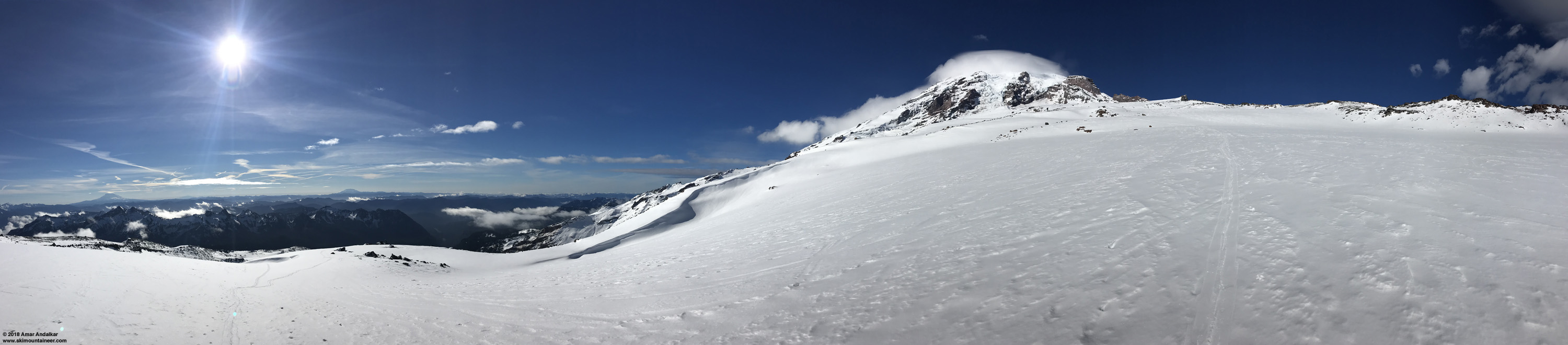 Panorama from about 7500 ft on the lower Muir Snowfield, looking much smoother here than it did a few days earlier. (click for triple-size version)