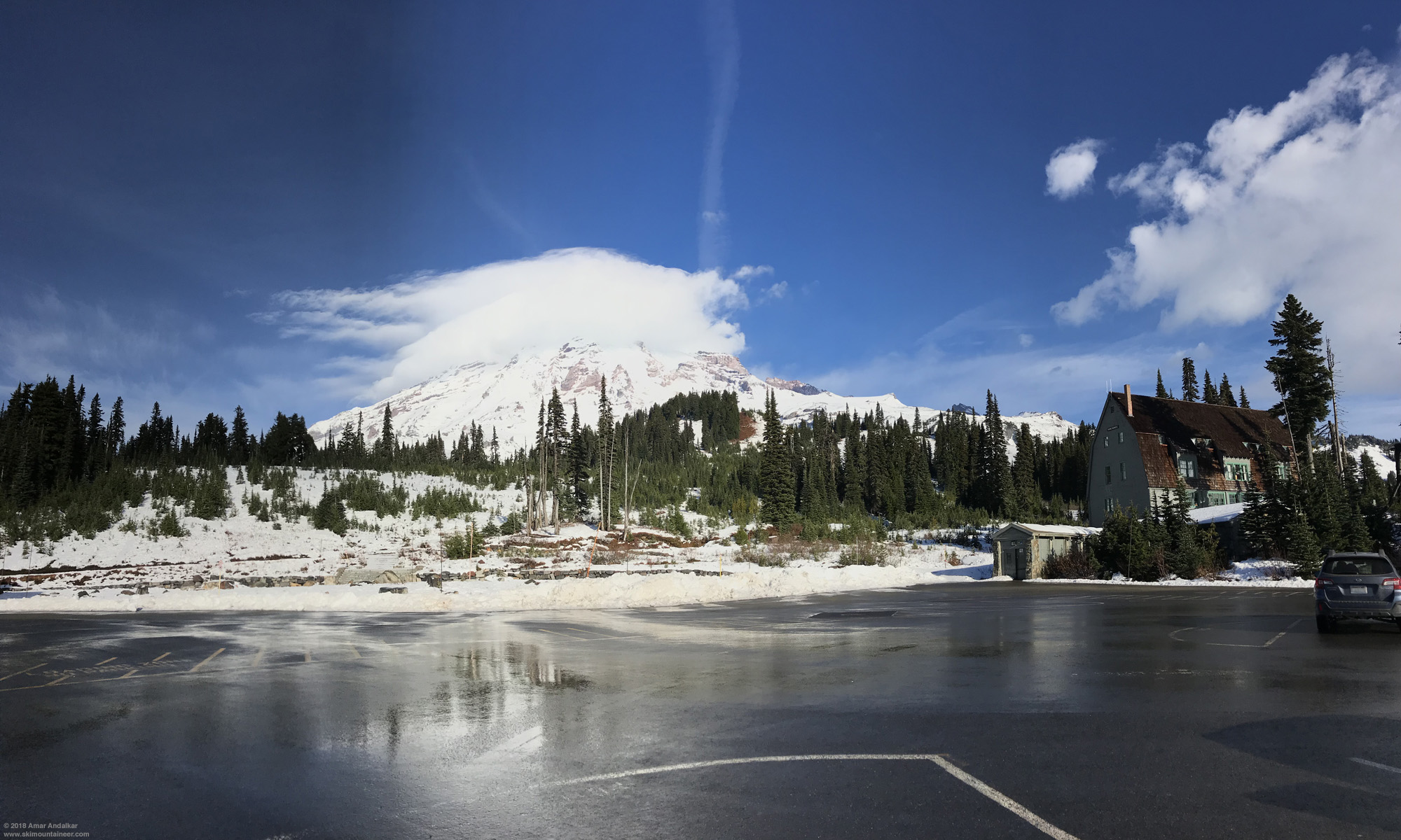 Small panorama of lenticular clouds capped the summit of Rainier, partially reflected in rainwater in the parking lot. (click for double-size version)
