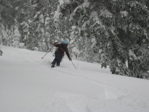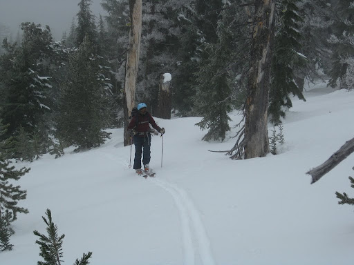 Brenda and I took a break from the holiday festivities in Roseburg to check out our usual Thanksgiving tour. Many years there's barely enough snow to skin from the car. This year there was plenty of coverage at the climbers trailhead (5400'). Broke trail for some 4 miles up to the west ridge and PCT crossing at 7400'. Mostly around 18" of very consistent settled powder on top of a very hard base. Previous days sun had released lots of tree bombs, so islands of nasty crust had to be avoided on the downhill. We did a short run down the southwest slope from the ridge then climbed up to just shy of 8000'. Found very nice snow on what I thought would have been totally wind wacked. Long cruise out with a short detour to avoid a huge 2 year old blowdown had us at the car at dark, as usual. Nice tour, but not a ton of turns. Though we still managed close to 3K vertical. Brenda got another chance to dial in her new NTN rig, this being her third time out on it. I think I've made another convert.