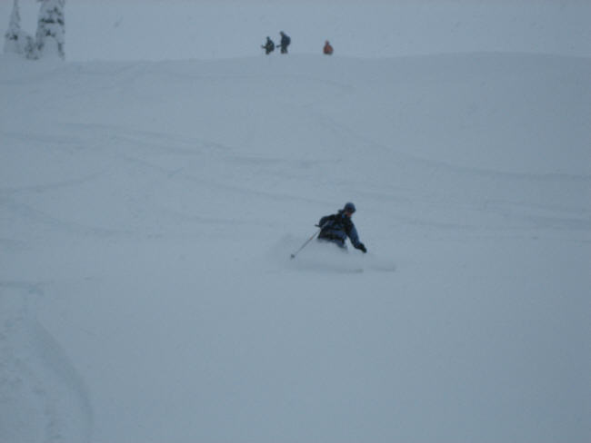 Our excitement for the day received a good dose of reality when we ran into our friend Kris who'd just skied back to the parking lot...his buddies had just witnessed another party trigger an 18" slab release near the Blueberry Chutes area (I think I'm getting my Baker geography correct, its just past the bc gate on the blueberry cat track facing the ski area parking lot)...first skier/boarder made it down okay, second caused the fracture and was buried...lots of folks actively searching. Heard shortly thereafter that he was found and alive.