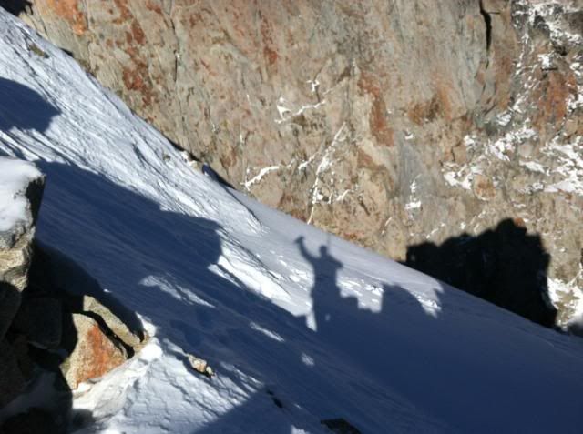 Im sorry to report that the skiing didnt live up to my expectations. Ol tsuyoshis tracks on Daniel were not to be recreated here. At least not today. Skiing was inconsistent. Best patches were the rippled wind buffed patches, but those were small. Between the good patches were crusty or ice chunks, or sugar/buff/sugar/buff sections. It was fun, but it wasnt good. The most challenging sections were those skinny patches where, days earlier, other climbers had walked side by side, leaving boot prints that froze. I couldnt side slip through those because the crust was too thin. I side-stepped a couple short sections that I would have otherwise slipped had the snow allowed it.
