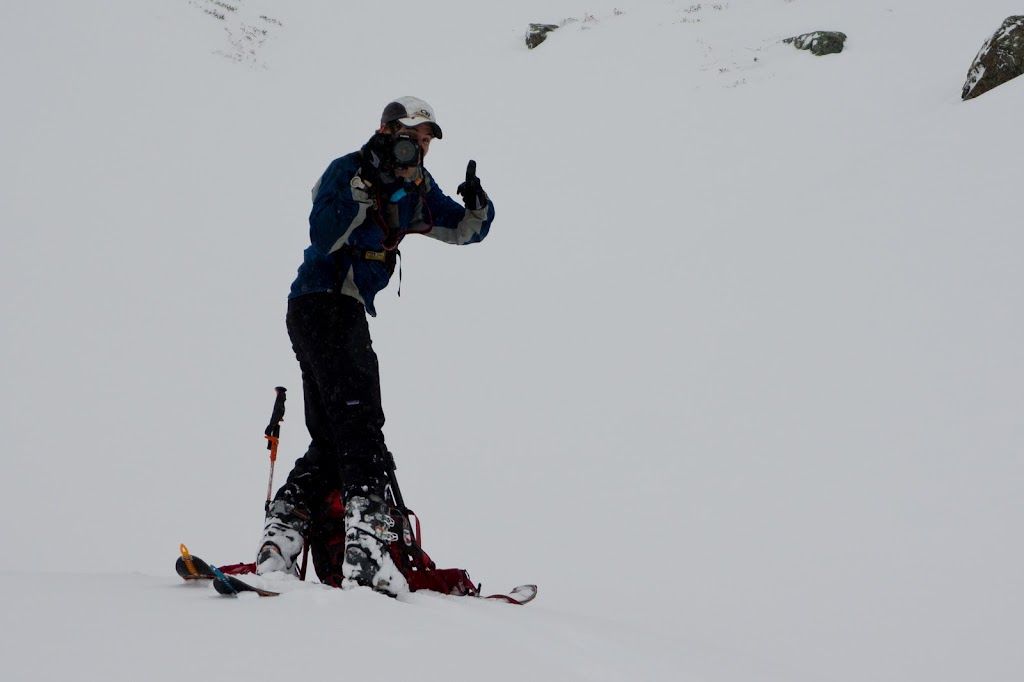 We played it safe skiing mellower semi-treed slopes skiers right, avoiding any major convexities, and enjoyed great snow and decent visibility.