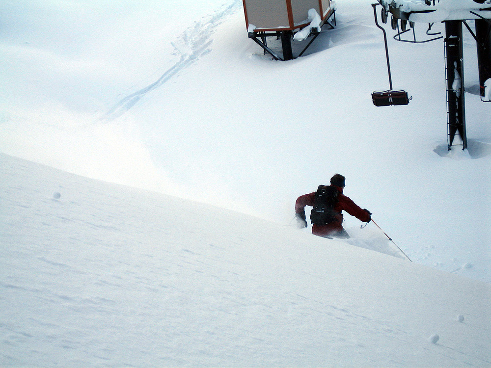 Our "bike commuters anonymous" group, consisting of Seth, Holly, John M., Eric N., Michael T. in from Switzerland and myself headed for Seventh Heaven at around 9:20 AM and found quite a crowd ahead of us - saw skiphotomatt and Jens K. near the top, then parted company with the masses to get first tracks skier's left of the 7th chair. Then back up to the ridge and down a nice open spot on the back of Cowboy, and finally further down the ridge to ski a narrow waterfall line next to the cliffs.