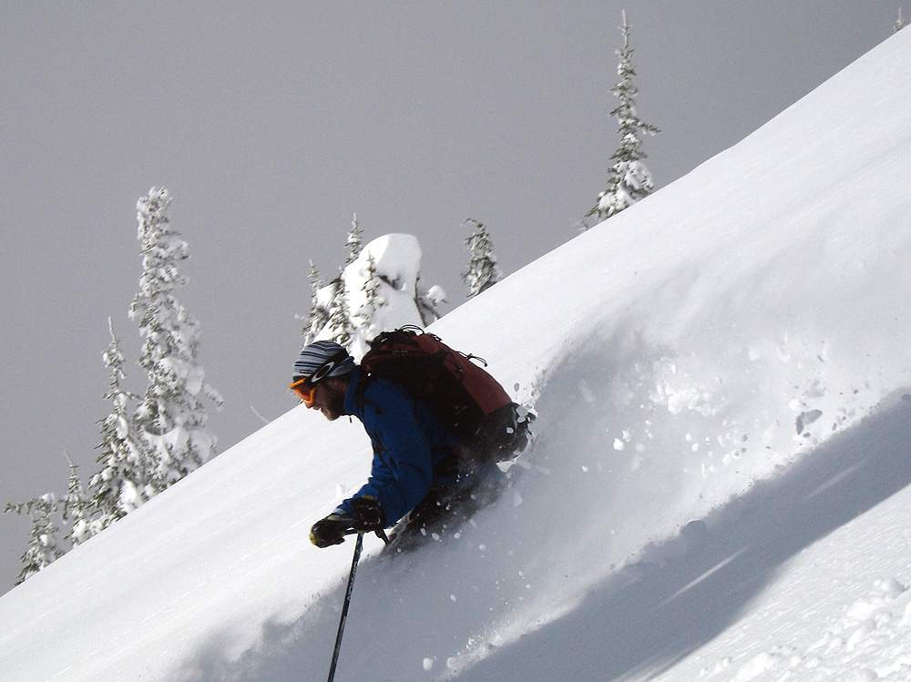 Excellent snow quality higher up, with a thickening sub-surface crust as you descended to lower altitude, particularly on the backside. More snow depth than we had expected, with good stability on the front side (mostly vegetally anchored); witnessed a couple of skier-induced slab releases that went approximately 25-30 ft. wide, shearing easily at about 10-11" on the crust layer on the backside of Cowboy Mt. Instability was quite localized as we couldn't get it to repeat elsewhere in the area.
