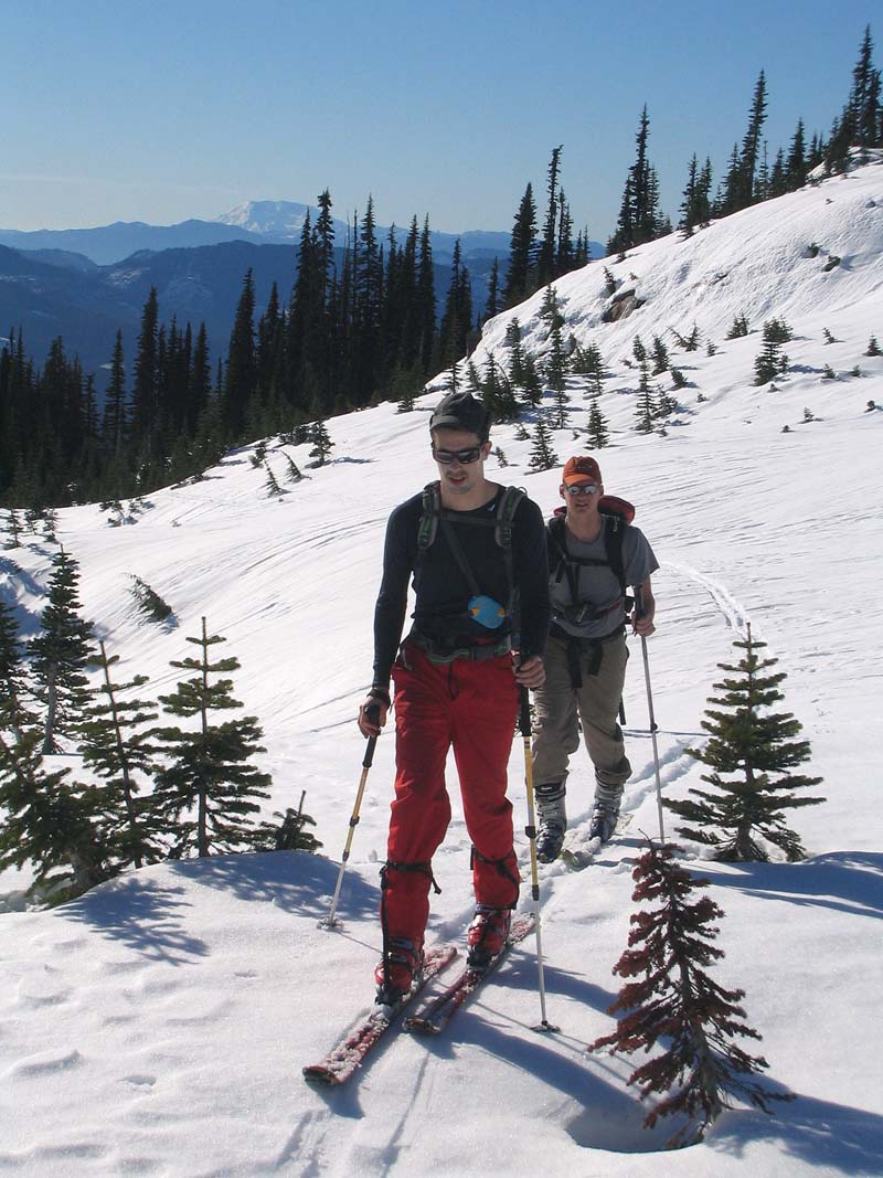 We hiked up the trail for about 800 vf before putting the skis on though there was probably enough snow to skin after 400 feet. We followed the trail to Comet falls along a steep flank just above the creek. The snow was already very mushy even though the slope had not been exposed to the sun yet. but it was stable enough for the ascent.