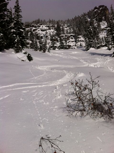 We skied from Pineapple and 3 runs back toward Piss pass and down by Trashcan in boot Top shaded conditions. Surprisingly good and cool throughou the morning and early afternoon.